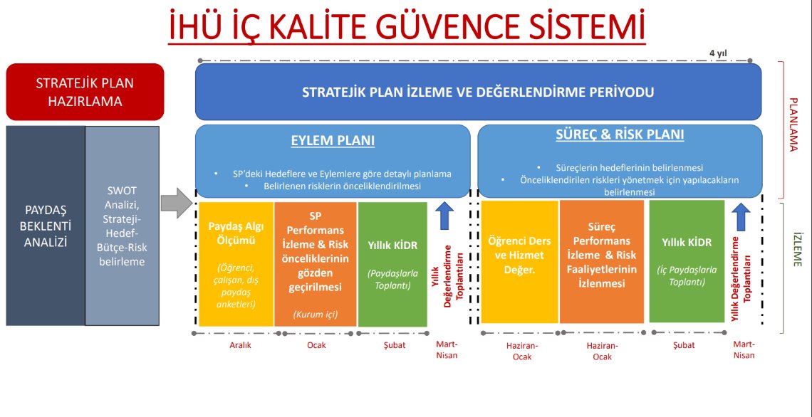 Kurumda, kalite güvencesi sistemi, 2022 yılında hazırlanmış olan kalite yönetimi süreci ile tanımlanmış ve İHÜ İç Kalite Güvence Sistemi modeli oluşturulmuştur. Bu modele göre, planlama, uygulama, kontrol etme ve izleme süreçleri farklı seviyelerde yürütülmektedir. Stratejik plan hazırlama periyodunda paydaş beklenti analizi, SWOT analizi, strateji, hedef, bütçe ve risk belirleme çalışmaları ile planlama faaliyetleri yürütülmekte; stratejik plan ve süreç yönetimi faaliyetlerinin uygulanmasının ardından performans izleme ve memnuniyet anketleri yoluyla izleme ve değerlendirme işlemleri yürütülmektedir. Kalite yönetimi süreci ve iç kalite güvencesi modeli, 2024 yılının Şubat ayında yürürlüğe giren İHÜ Kalite Güvencesi Yönergesi ile güvence altına alınmıştır.